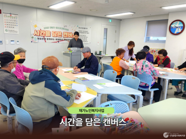 신정종합사회복지관에서는 재가노인복지사업 어르신 24명을 대상으로 ‘시간을 담은 캔버스’ 프로그램 첫 회기를 진행하였습니다.